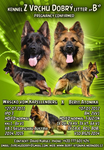 Vrh "B"5. 9 2016 se Berče narodil vrh "B" ze spojení Berit Atonika x Wascko vom Kapellenberg 8 pejsků - vlkošedý a znakatý 1 fenka -vlkošedá